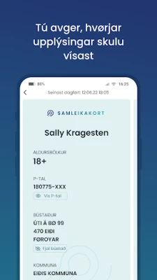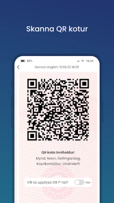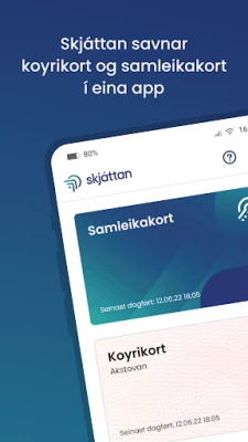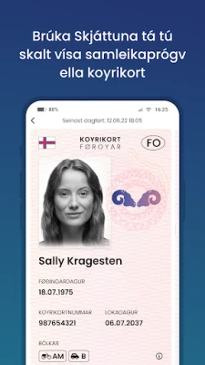 Upptäck Skjáttan, din digitala följeslagare för en smidigare vardag på Färöarna. Denna innovativa applikation omdefinierar hur du presenterar din identitet och dina behörigheter i samhället. Med Skjáttan kan du tryggt och säkert förvara dina viktigaste dokument direkt i din enhet, redo att användas när du behöver dem som bevis vid olika tjänster och ärenden. Det är en modern lösning som effektiviserar interaktionen med offentliga och privata aktörer.