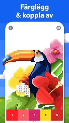 Stig in i en värld där avkoppling möter kreativitet, skapad för alla som söker ett lugnande avbrott i vardagen. Pixel Art, designat av spelexperter och älskat globalt, erbjuder en unik möjlighet att fördjupa dig i konsten att färglägga. Med en ständigt växande samling av över 40 000 konstverk, från intrikata mandalor till fantasifulla scener, eller friheten att pixla dina egna bilder, blir varje stund med Pixel Art en meditativ resa. Upplev enkelheten i att färglägga efter siffror och se hur vackra mästerverk växer fram under dina fingrar.